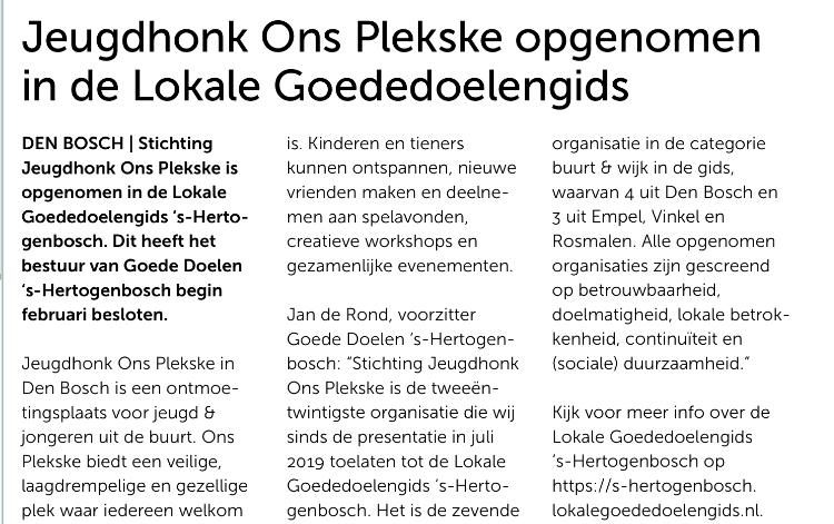 Jeugdhonk Ons Plekske opgenomen in de Lokale Goededoelengids 's-Hertogenbosch